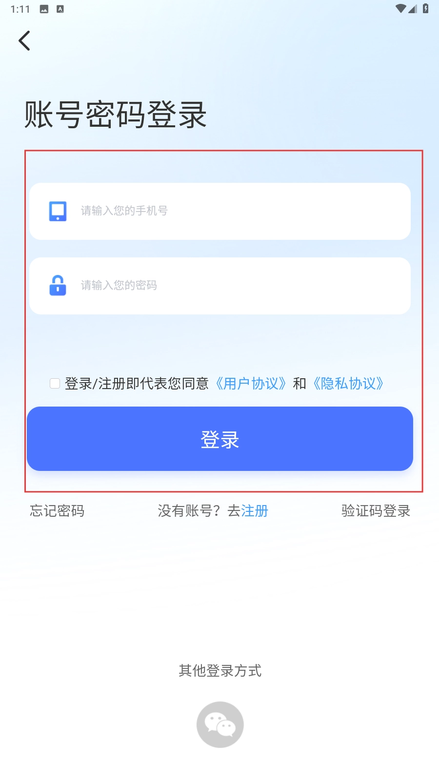 进入账号登录页面,填写【手机号码】和【登录密码】就能完成登录操作。