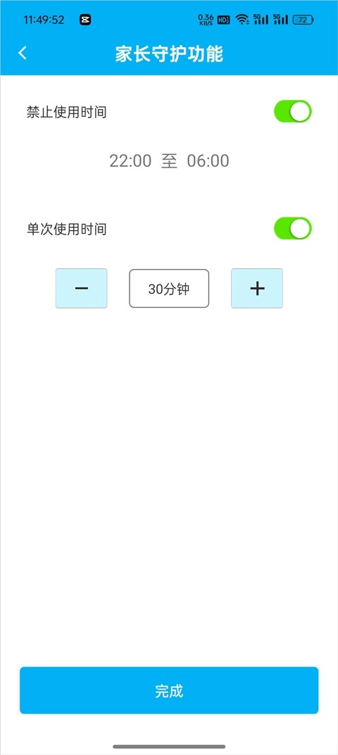 2、支持家长对软件设置使用时长,以此限制孩子的使用时间。