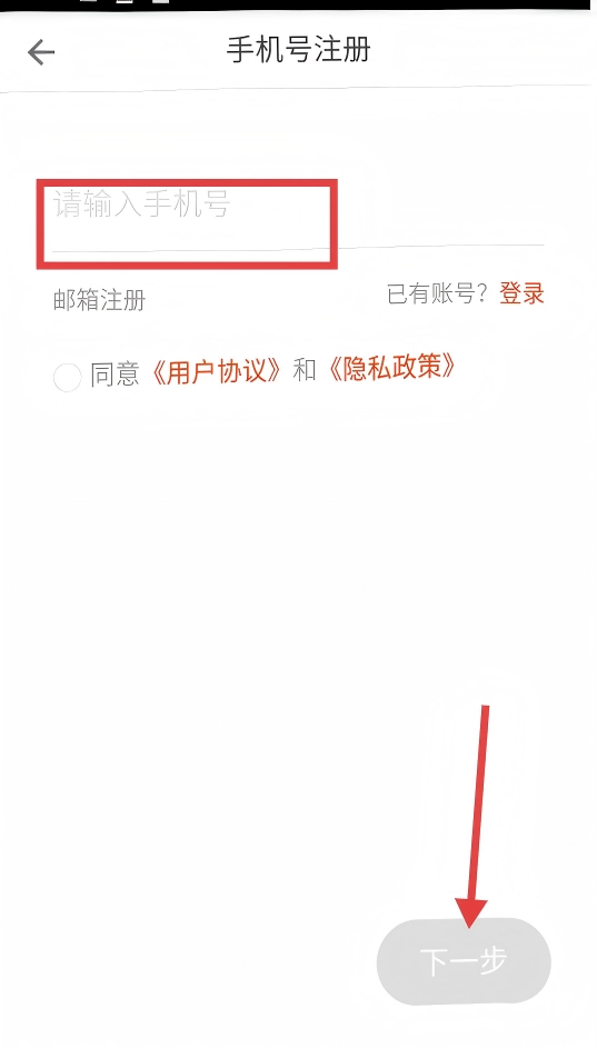在【手机号注册】页面,输入手机号后,点击【下一步】按钮继续注册流程。