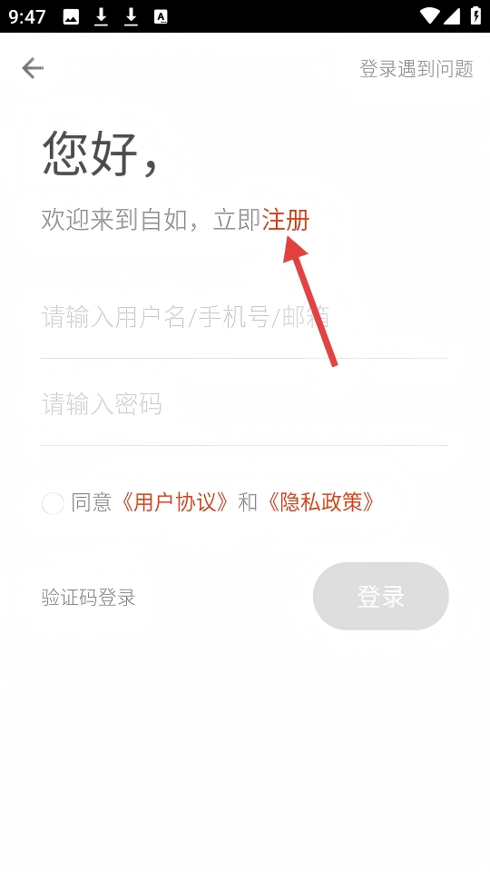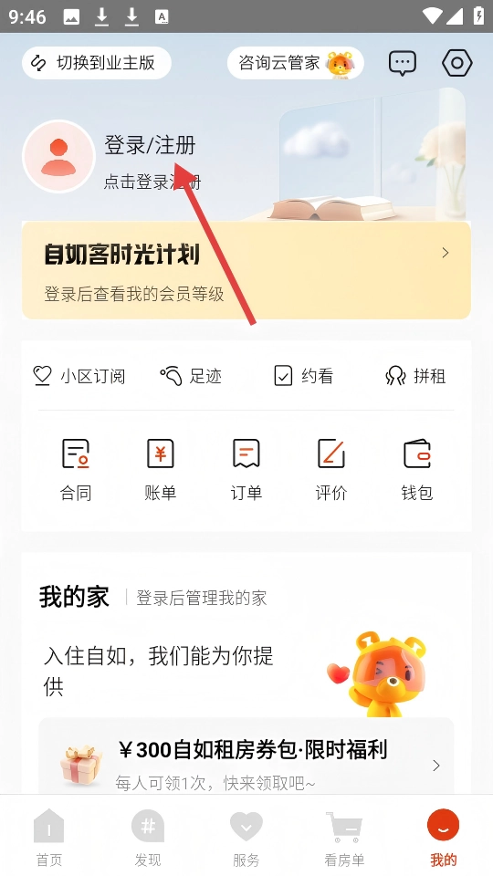 在【我的】页面,点击【登录/注册】按钮,即可进入登录注册界面。