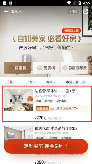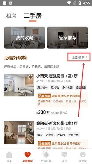 在【必看好房】页面,点击【全部榜单】选项,即可进入完整的好房榜单页面,查看更多优质房源。