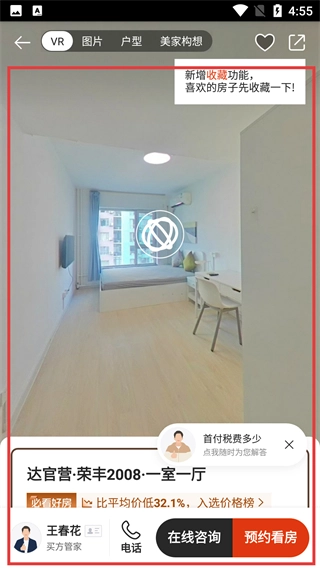 进入房源详情页后,您可以借助【VR】功能查看房屋的真实场景,也能点击【预约看房】按钮,联系管家来安排实地看房事宜。