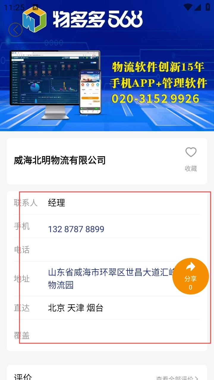 选择物流企业后进入详情页面,就能查询到联系人、手机号码、地址、直达城市等相关信息,之后可以拨打电话联系并完成下单操作。