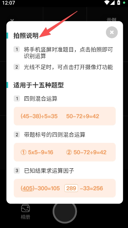 请先查看拍照说明,然后按照指引将手机竖屏对准题目,点击拍照按钮进行识别运算。