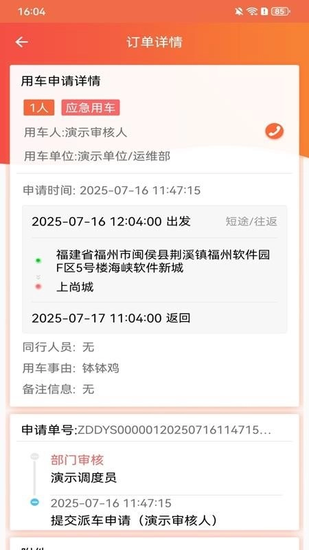 软件支持线上生成用车需求,只需输入目的地,即可一键提交用车申请,并且能实时完成审批流程。