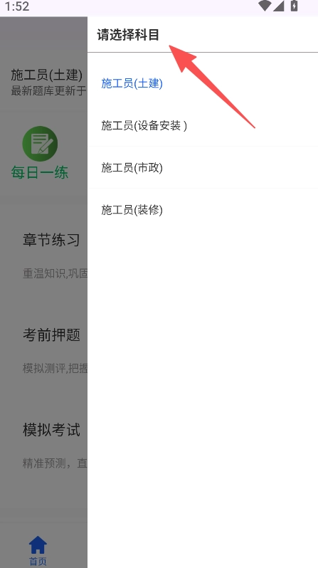 支持考生选择施工员相关科目,比如土建、设备安装等,以此明确对应考试的备考题库范围。