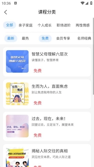 课程分类十分细致,涵盖亲子家庭、个人成长等诸多类别,并且每个类别下还设有最新、最热等不同的排序方式。
