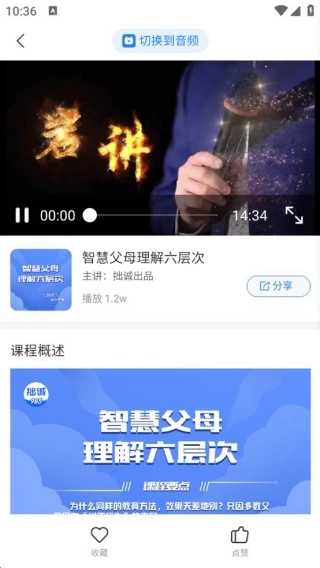 2、提供音视频切换功能,用户能够依据自身的学习场景与偏好,在音频学习形式和视频学习形式之间灵活地进行切换。