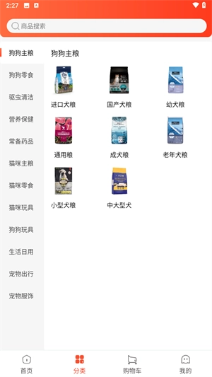 1、打开应用后,点击进入商城板块,映入眼帘的是琳琅满目的商品分类,这里我选择了狗狗主粮这一品类。
