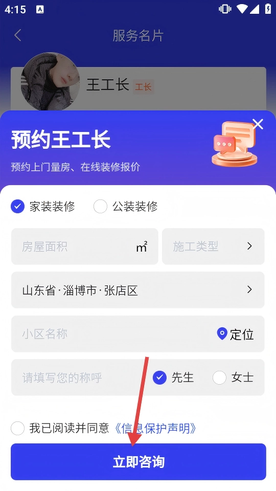 在服务名片页面,查看工长的服务信息,确认匹配需求后,点击底部【咨询TA】按钮,进入预约咨询信息填写页面。