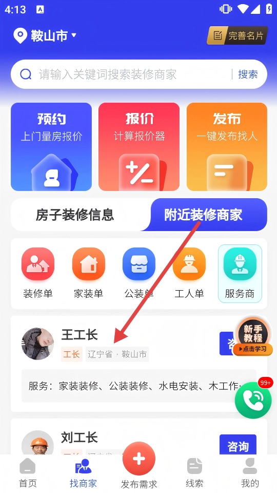 你可以在附近的装修商家列表里挑选心仪的工长,然后点击进入他的服务名片页面。