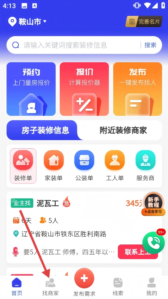 打开后,点击底部导航栏中的【找商家】按钮,接着切换至附近装修商家的标签页。