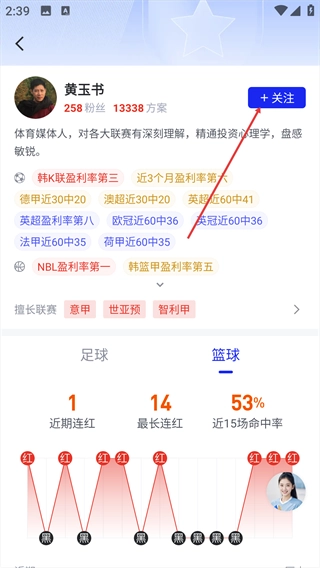 进入专家详情页面后,点击右上角的“+关注”按钮,即可完成对该专家的关注。