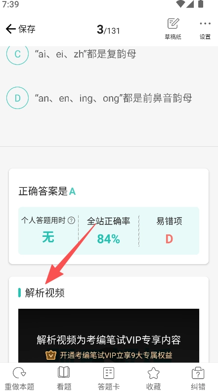 做题后会呈现正确答案以及全站正确率,同时配备解析视频,为备考过程提供答题反馈和知识解析方面的支持。