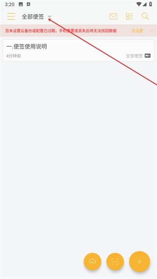 打开小周便签应用,点击顶部的全部便签选项,展开对应的操作菜单。