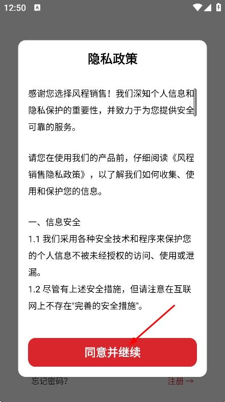 1、在隐私政策弹窗中,点击同意并继续,进入。