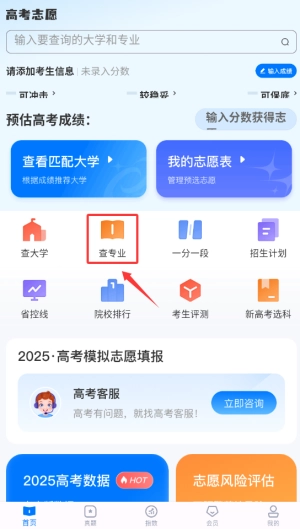 启动应用程序后,在首页的导航栏中找到并点击“专业查询”功能选项,即可进入院校专业库页面。