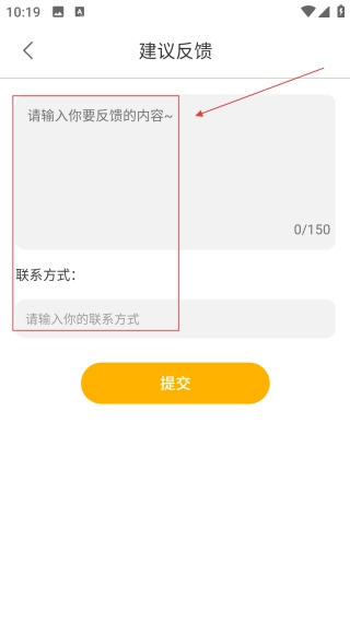 在建议反馈页面填写反馈内容和联系方式,为提交反馈信息做准备。