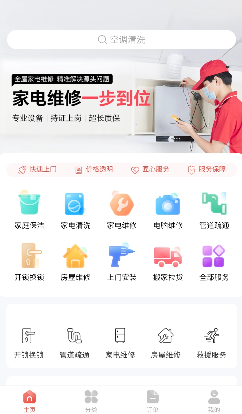 全维服务矩阵:聚焦数码家电维修、管道疏通、防水补漏等七大核心板块,打造覆盖家庭维修全场景的综合服务体系。