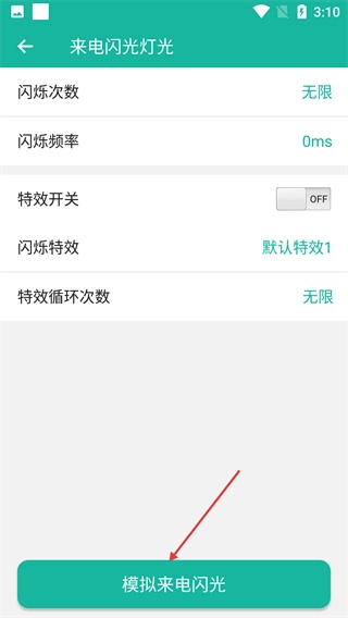 在来电闪光灯光参数设置页面,点击【模拟来电闪光】按钮,即可对来电闪光效果进行测试。