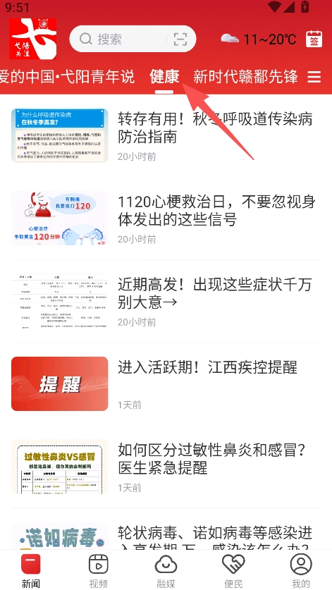 板块布局清晰明了,健康、新闻、视频等板块划分明确,操作流程简洁直观,便于用户迅速获取健康资讯与本地信息。