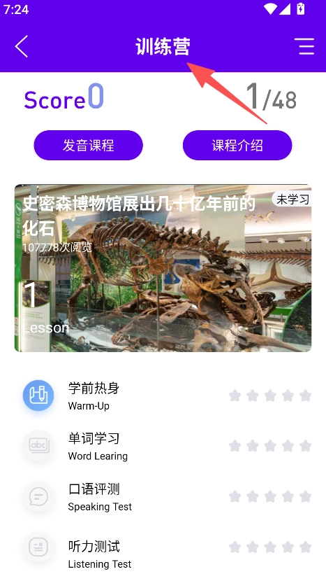 训练营学习功能已实现,涵盖发音课程、单词学习、听力测试等内容,助力用户系统提升英语综合能力,功能十分全面。