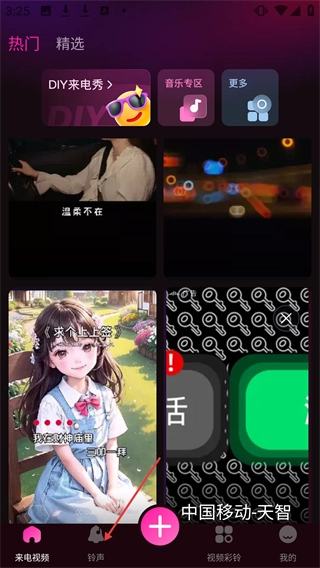 在来电视频主界面点击底部的【铃声】按钮,即可进入铃声页面。
