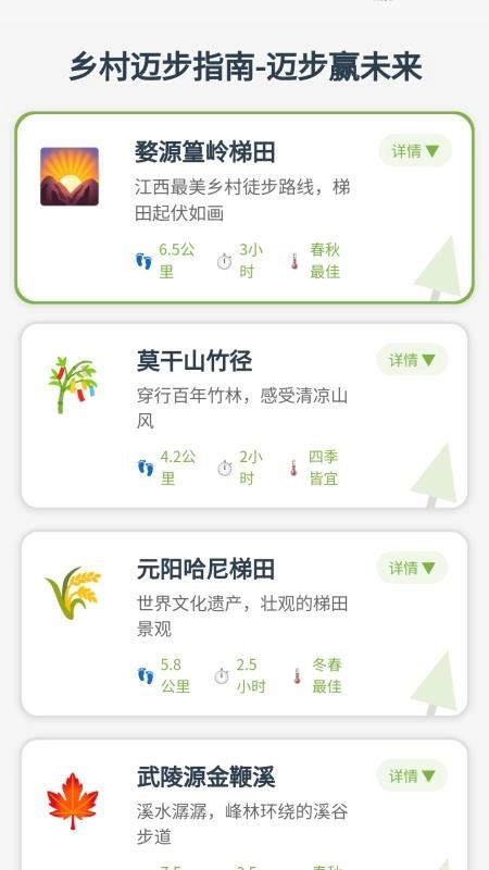 迈步赢是一款专注于乡村旅游的服务平台,平台上汇集了众多自然风光景点,用户可在应用内自由浏览,深入了解乡村的各类景象,从而更有针对性地选择体验项目,舒缓浮躁的心情;平台提供极为详尽的景点信息,涵盖景点位置、行程时长、最佳旅游季节等内容,方便用户高效规划行程,满足个性化出行需求;应用界面简洁直观,各类信息清晰呈现,让用户能更便捷高效地找到心仪景点;此外,用户还能在应用中实时查看诸多金句,感受名人名言的魅力,激励自己以更高效、积极的态度面对生活;感兴趣的朋友欢迎在线使用迈步赢最新版软件。