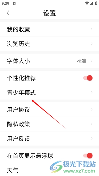 进入“设置”界面后,要点击选项列表里的“青少年模式”。