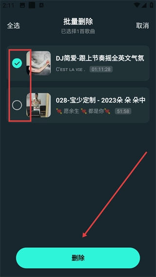 进入删除界面后,勾选想要删除的目标曲目,再点击底部的“删除”按钮即可。