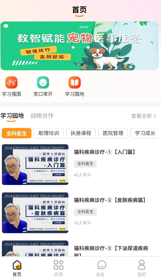 打开宠医宝应用后,在首页找到“学习园地”板块,进入后浏览各类宠物医疗课程,挑选自己感兴趣的内容。