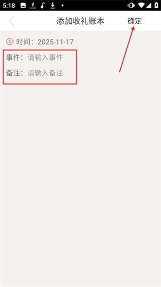 在添加收礼账本的页面里,填写事件与备注信息后,点击【确定】按钮。