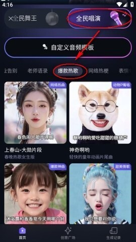 打开进入后,在“全民舞台”板块点击“对口型唱歌”选项,随后选择“全民唱演”分类,再从“爆款热歌”专区里挑选一个合适的模板。