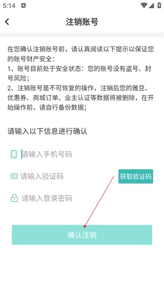 进入账号注销页面后,依次填写手机号码、验证码和登录密码,最后点击【确认注销】按钮,即可完成账号注销流程。