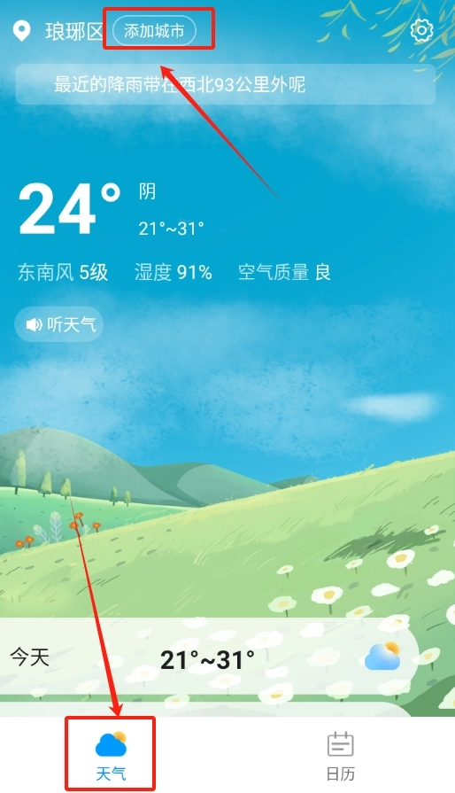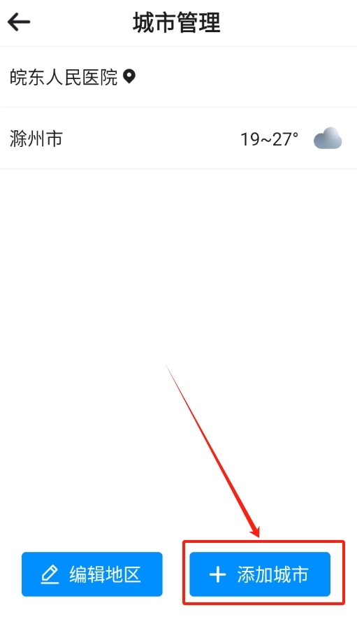 打开软件后直接查看首页,在页面的左上角有一个小小的添加城市按钮,点击该按钮即可开始进行操作。