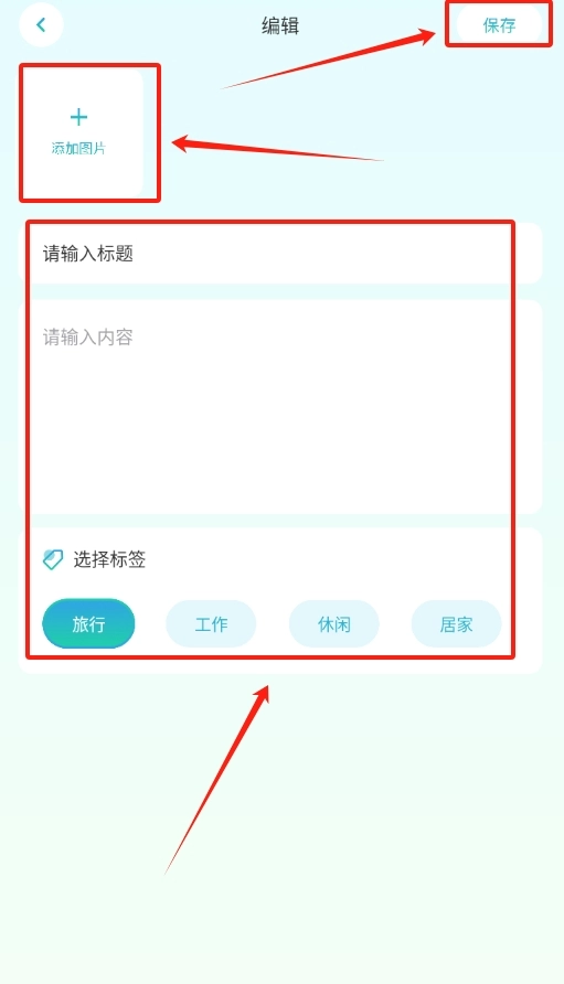 紧接着,从相册里挑选合适的照片添加进去,在对应的位置输入记录的标题和详细内容,再加上相关的标签,全部设置好后点击右上角的保存按钮。