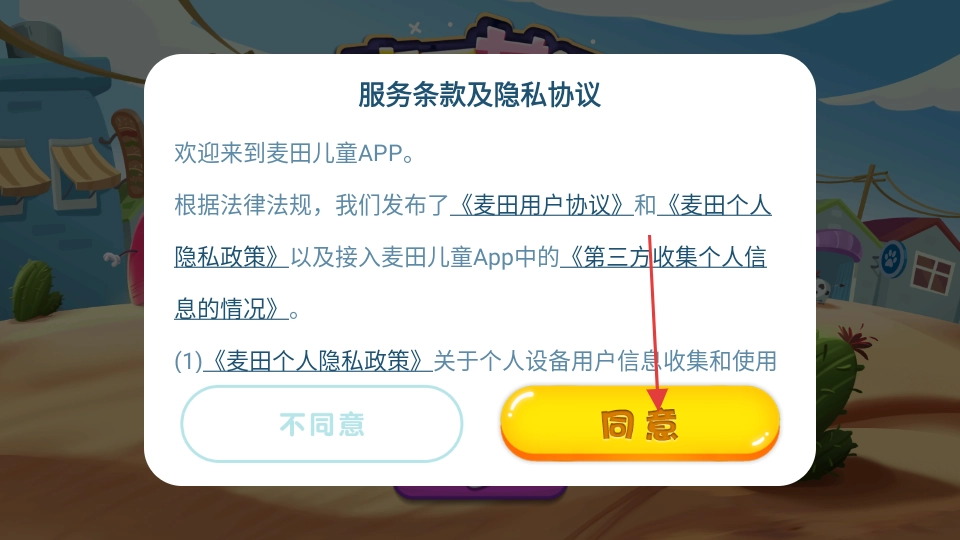 阅读【服务条款及隐私协议】,点击【同意】进入。