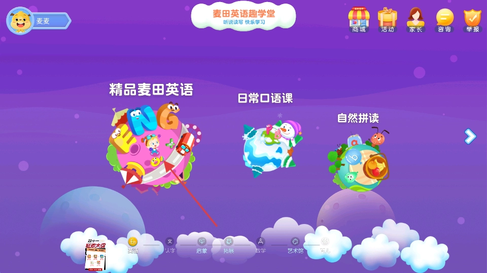 在首页点击【精品麦田英语】,进入英语学习板块。
