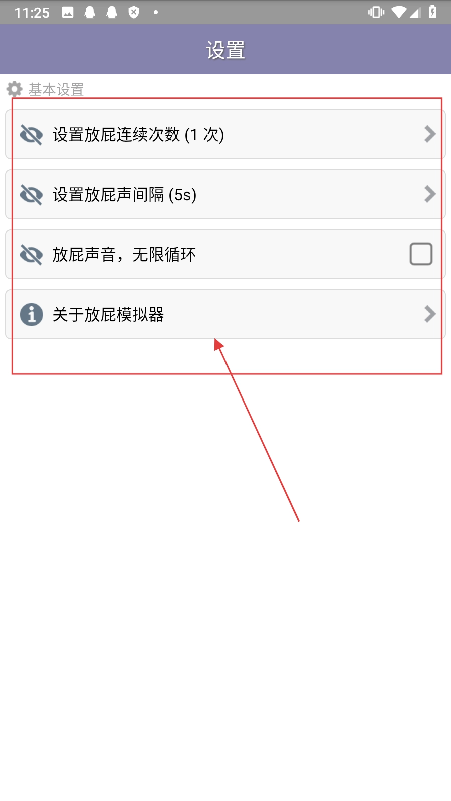 进入设置界面后,能够对【放屁的连续次数、放屁声之间的间隔时长,以及是否开启放屁声音的无限循环功能】进行设置,以此来管理屁声模拟相关的各项配置。