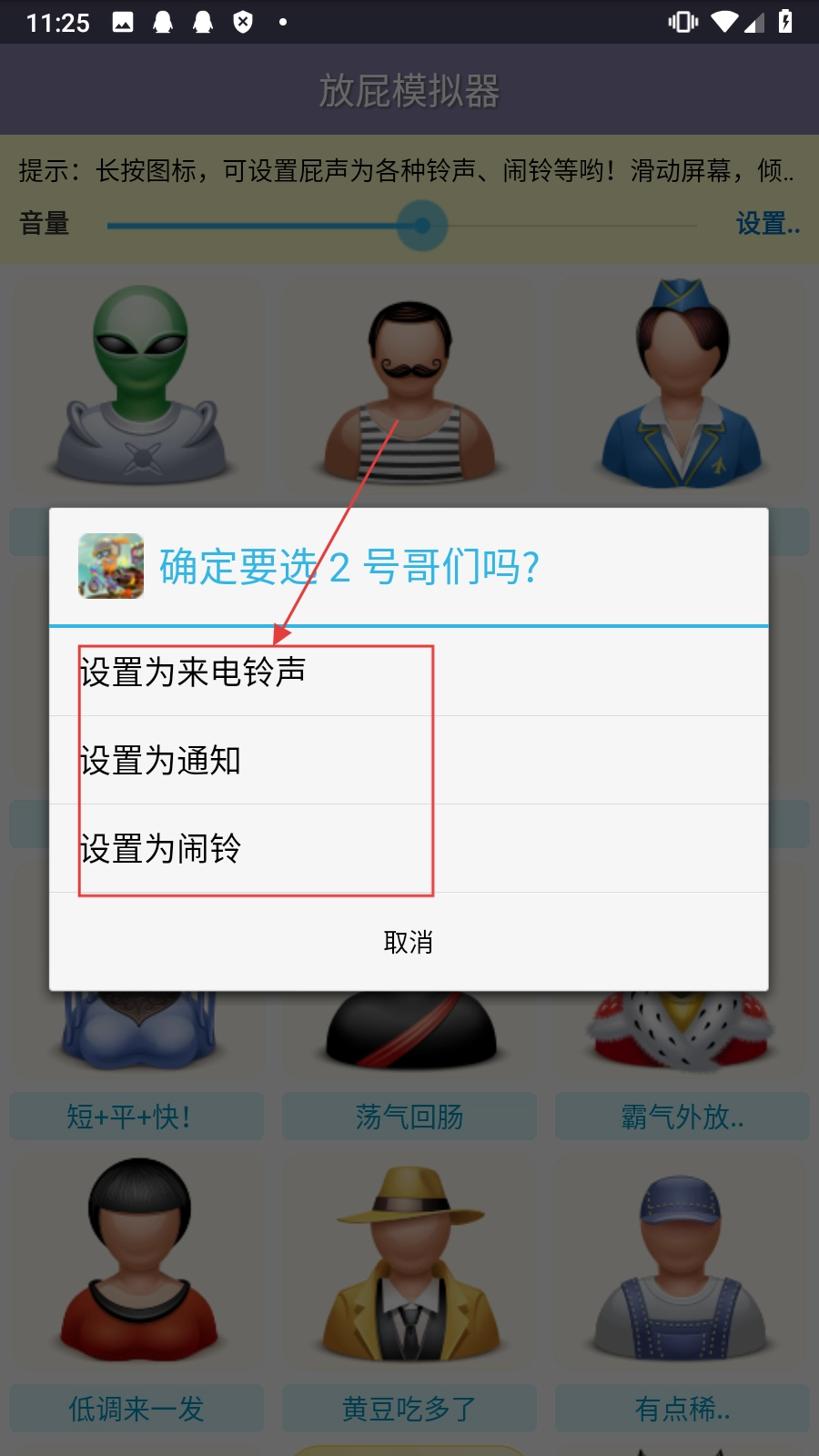 长按图标,就能把【屁声设置成来电铃声、通知提示音或者闹钟铃声】,这样就能体验个性化的屁声提醒设置啦。