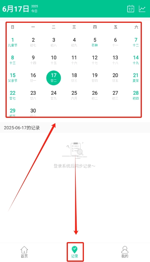 进入记录页面后,能看到页面上设有日历标识,点击该日历标识,即可依据日期来查询每日的抽烟量,便于进行回顾。