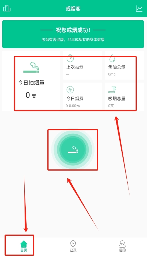 成功登录后回到软件首页,在醒目的位置可以方便地记录下当天抽烟的具体数量。