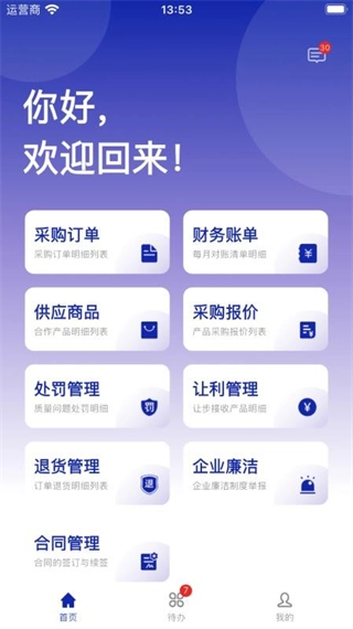 3. 首页就能直接看到采购订单、财务账单、供应商品等功能板块。