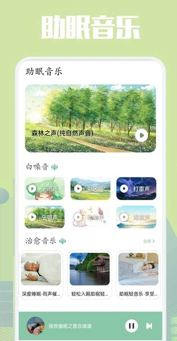 2. 海量声音资源,涵盖各类白噪音与治愈系音乐,可自由选择收听,助你快速进入睡眠状态