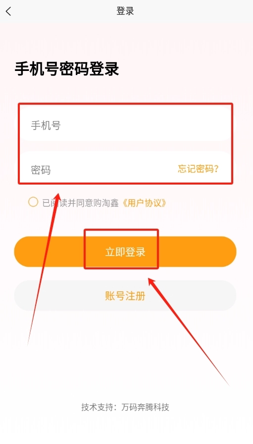 进入登录界面后,找到对应的输入区域,把你注册时用的手机号准确输入到手机号框里,再将之前设置好的密码填入密码框,最后点击登录按钮即可。