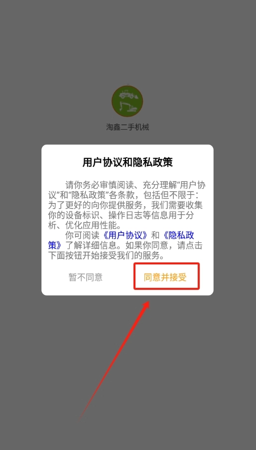 第一次打开淘鑫二手机械软件时,屏幕上会弹出软件协议,仔细查看确认没有问题后,就直接点击同意了。