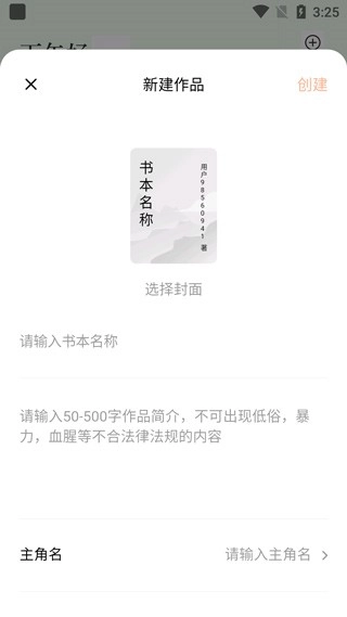 3、填写书名、作品介绍、主角名字、目标读者群体等相关信息,完成后点击创建按钮,即可发布自己的作品。