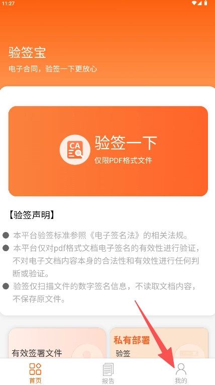 《验签宝》是一款专注于电子合同验签的工具。软件严格遵循相关规范,核心功能为验证PDF格式文档的电子签名有效性。首页突出“验签一下”按钮,操作路径明确。验签过程仅扫描文件数字签名信息,不读取、不保存文档内容,确保原始文件安全与隐私。底部导航栏设置首页、报告、我的三大模块,结构清晰。该软件精准解决电子合同签名验证需求,流程简洁,安全可靠。