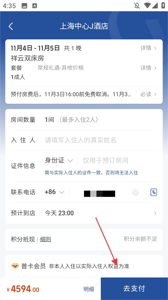 在预订信息填写页面,依次填写入住人、证件信息、联系电话等内容后,点击【去支付】按钮。