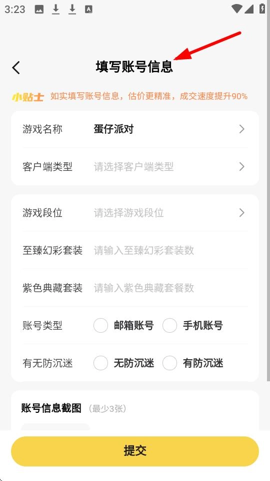 在【填写账号信息】页面,如实填写【蛋仔派对】的客户端类型等相关信息并提交,能够帮助提高账号估价的精准度,同时加快成交速度。